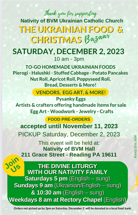 Saturday, March 27, 2021 10am – 3pm HOMEMADE UKRAINIAN FOODS Pierogi – Halushki – Stuffed Cabbage – Potato Pancakes Nut Roll, Apricot Roll, Poppyseed Roll & Paska UKRAINIAN SAMPLER PLATTER $10 Kielbasa & Kraut, 2 Pierogi, Halushki, 1 Stuffed Cabbage, Rye Bread POTATO PANCAKES $9 6 Ready To Eat Potato Pancakes EASTER FOOD SALE PRE-ORDER FORM ALL […]